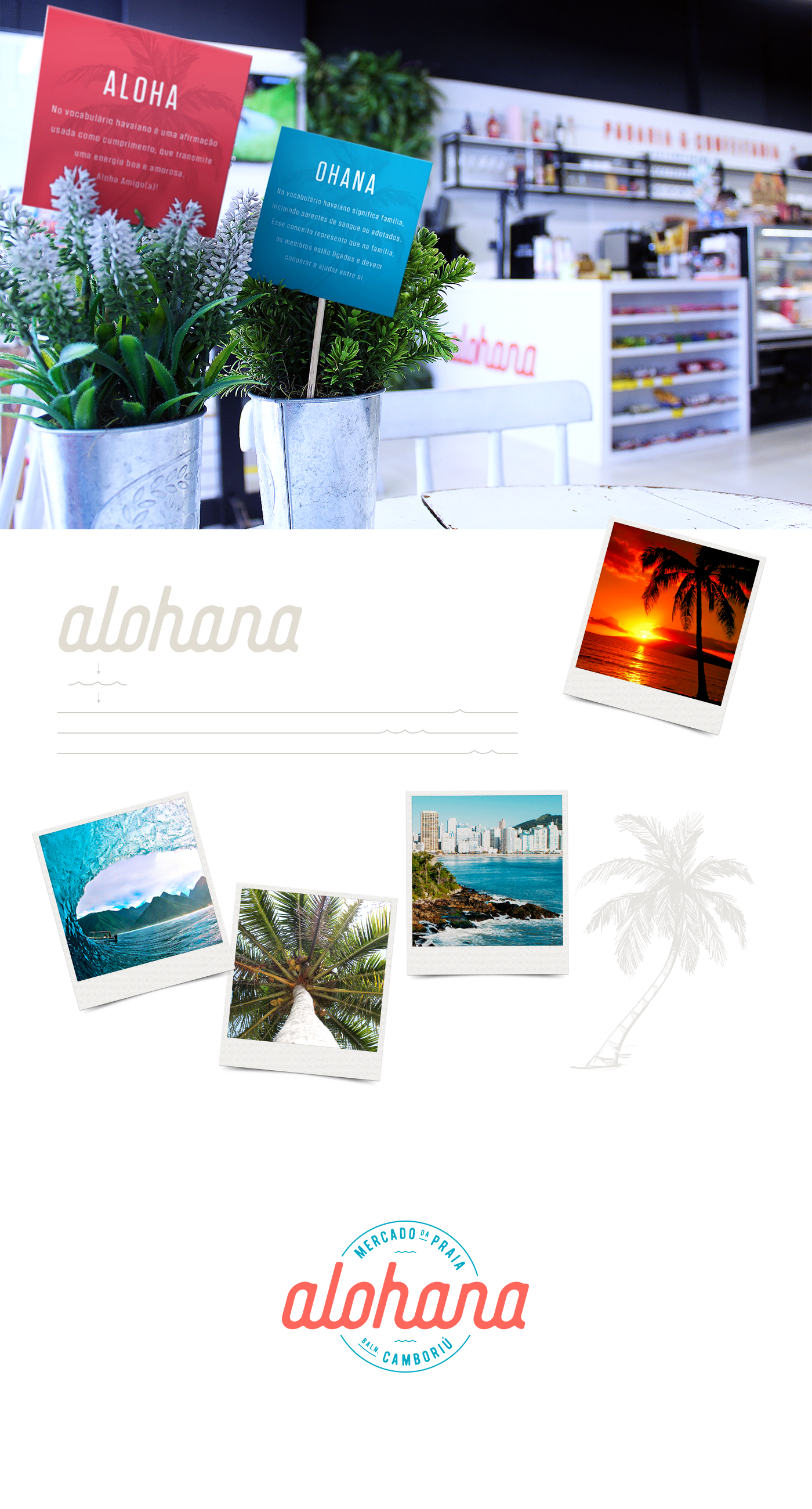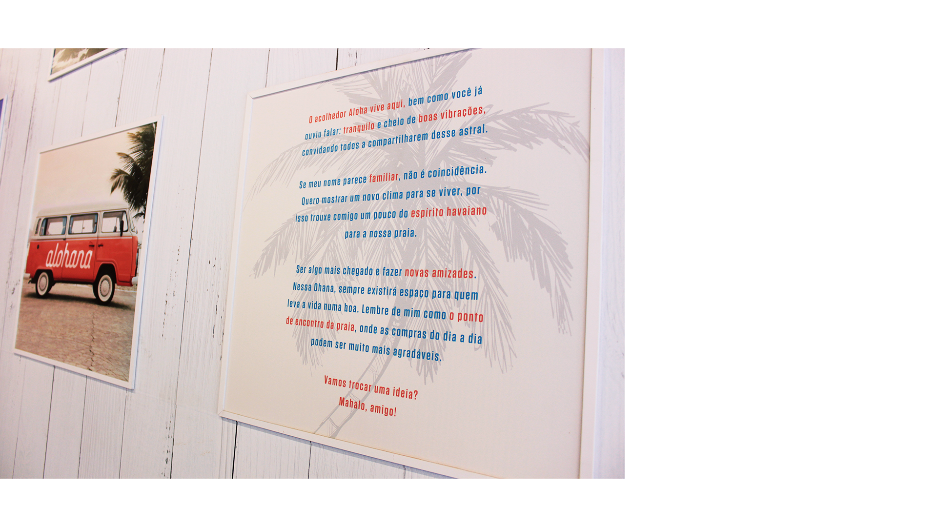 A strategy was developed that awoke the essence of the brand, having as central concept "to generate a family of friends". The creative insight of the project was the inspiration in Hawaii, where there is a calm and peaceful rhythm of life. After the Naming stage concluded approaching Hawaiian concepts, the visual identity system was developed, also replicated to the market environment. The verbal universe reinforces and spreads the concept of the brand in the store.